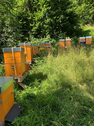 In Habsburg stehen nur eine Geh-Minute entfernt ein kleiner Bienenstand mit Platz für bis zu vier Wirtschaftsvölker inmitten einer BIO-Wiese. Diese Völker dienen uns als Ortientierungshilfe für die Vorgänge in den anderen Völkern an den weiter entfernten Bienenständen. Das hilft uns bei der Planung der nächsten Arbeiten und Einsätzen.